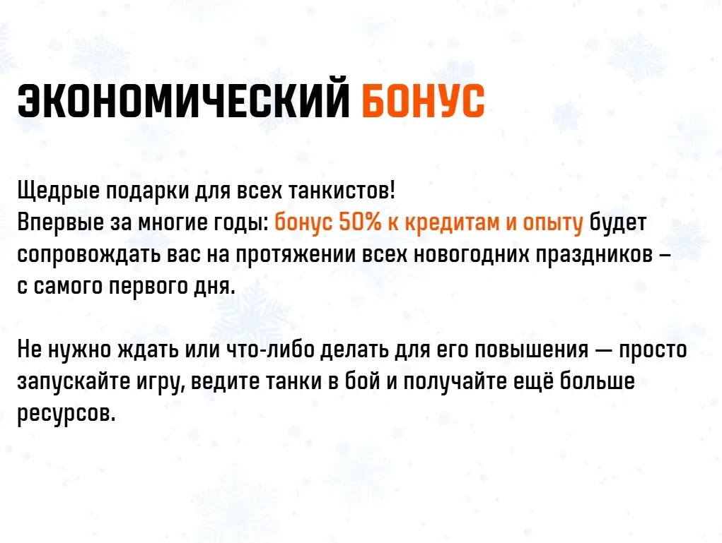 Впервые постоянный бонус +50% к кредитам и опыту на всё «Новогоднее наступление» сразу у всех без каких-либо условий!