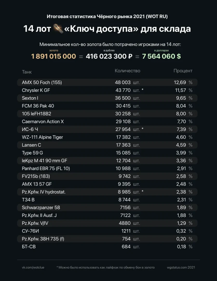 Подъехала статистика отдельно по 14 лоту («Ключ доступа») прошедшего ЧР2021. Ну что можно сказать, WG молодцы, только с 14 лота они заработали больше, чем со всего Чёрного рынка 2021. А именно: ровно в 3 раза больше.