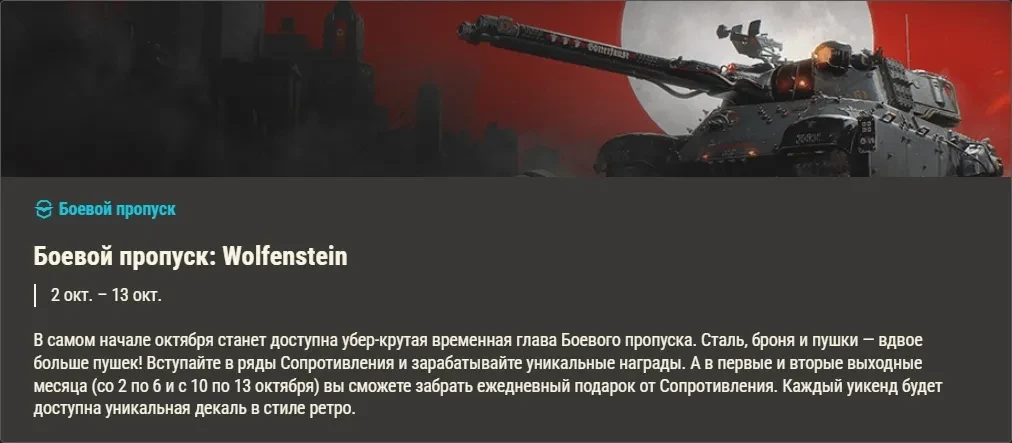 В самом начале октября станет доступна убер-крутая временная глава Боевого пропуска. Сталь, броня и пушки — вдвое больше пушек! Вступайте в ряды Сопротивления и зарабатывайте уникальные награды. А в первые и вторые выходные месяца (со 2 по 6 и с 10 по 13 октября) вы сможете забрать ежедневный подарок от Сопротивления. Каждый уикенд будет доступна уникальная декаль в стиле ретро.