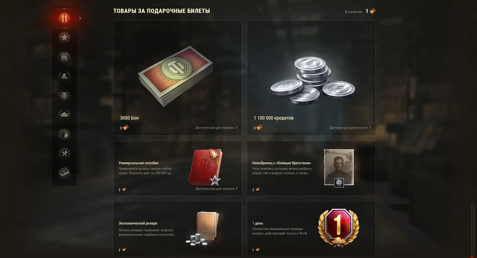 В специальном разделе Магазина будет доступно множество игровых ценностей, в том числе боны, универсальное пособие, кредиты, члены экипажа с «нулевым» навыком «Боевое братство», личные резервы с надбавкой к кредитам и дни Танкового премиум аккаунта.
