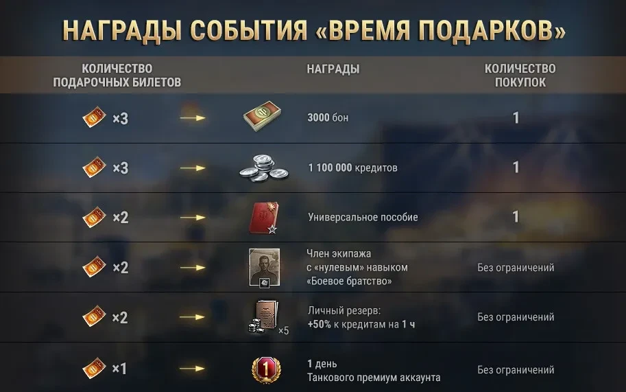 В течение события «Время подарков» суммарно вы можете получить семь дней Танкового премиум аккаунта и семь подарочных билетов — за семь первых входов в игру.