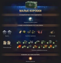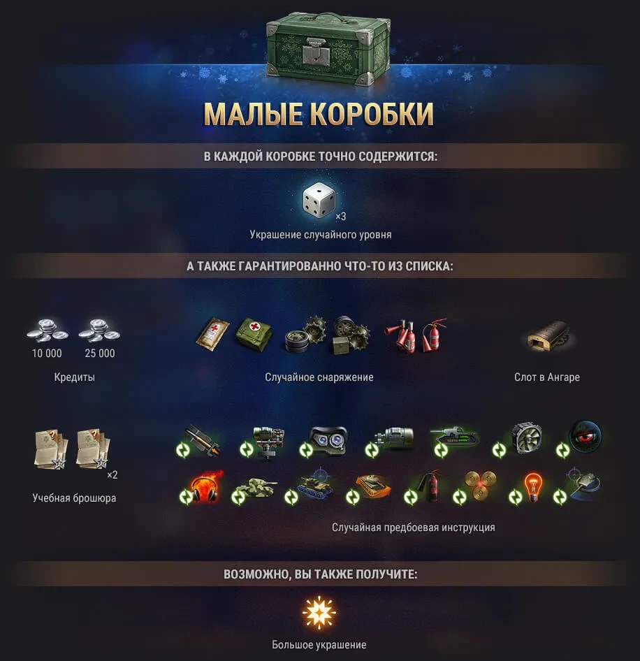 Каждая Малая коробка содержит 3 украшения случайного уровня, а также случайное игровое имущество: кредиты, снаряжение, учебные брошюры, предбоевые инструкции или слот. Если вам улыбнётся удача, в коробках может попасться и большое украшение.