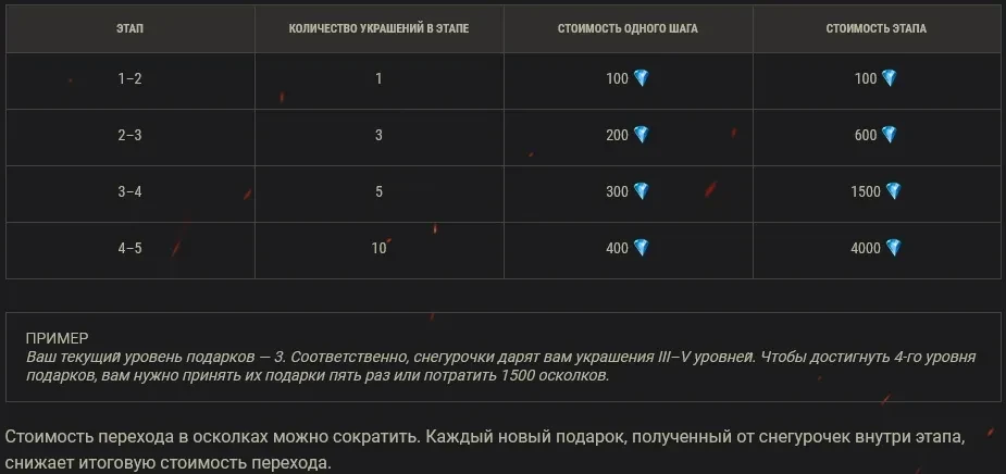 Стоимость перехода в осколках можно сократить. Каждый новый подарок, полученный от снегурочек внутри этапа, снижает итоговую стоимость перехода.