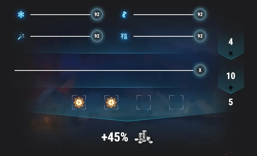 - Сбор коллекций и увеличение уровня атмосферы праздника дадут вам до 40% бонуса к кредитам в случайных боях.