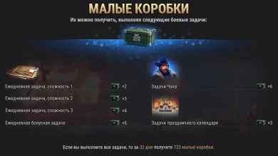 - Малые коробки также можно получать за выполнение ежедневных задач и задач праздничного календаря.