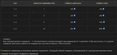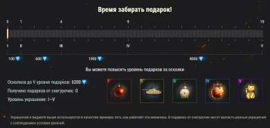 ПРИМЕР: Ваш текущий уровень подарков — 3. Соответственно, снегурочки дарят вам украшения III–V уровней. Чтобы достигнуть 4-го уровня подарков, вам нужно принять их подарки пять раз или потратить 1500 осколков.
