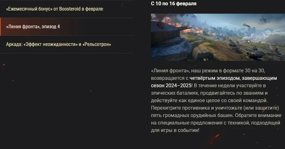 «Линия фронта», наш режим в формате 30 на 30, возвращается с четвёртым эпизодом, завершающим сезон 2024–2025! В течение недели участвуйте в эпических баталиях, продвигайтесь по званиям и действуйте как единое целое со своей командой. Перехитрите противника и уничтожьте (или защитите) пять громадных орудийных башен. Обратите внимание на специальные предложения с техникой, подходящей для игры в событии!