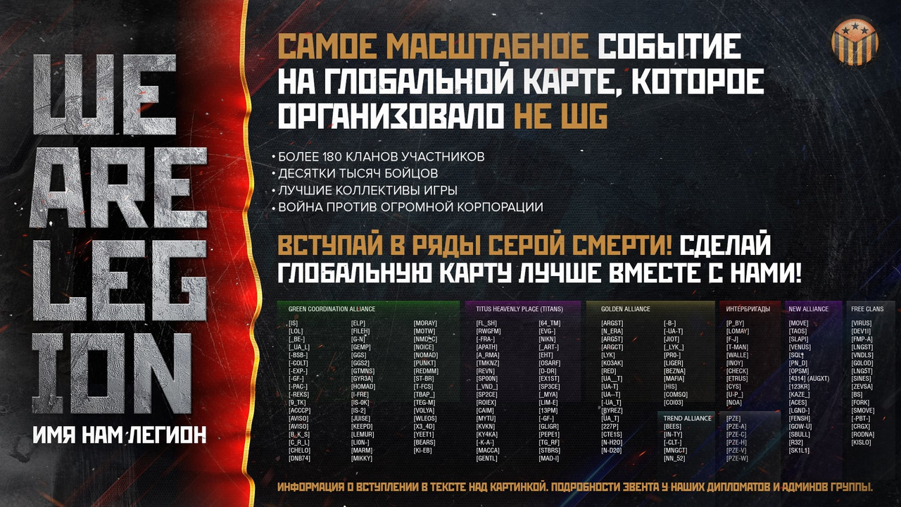 Для чёткого соблюдения нашего плана нам нужна помощь большинства коллективов этой игры, играющих на глобалке. К нам уже присоединились сотни кланов и нам не хватает только Вас. Только объединившись мы отстоим своё право на нашу глобальную карту и свой любимый режим.