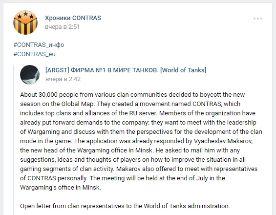 Контакты, как вы понимаете, были отправлены и сегодня состоялись переговоры. По итогам переговоров мы понимаем, что руководство компании на Кипре с тревогой восприняло наше движение и выразило заинтересованность в конструктивном диалоге. Г-н Макаров попросил прислать на личную почту все наши предложения, как по ГК, так и по Клановому и Альянсовому функционалу. Кроме того представителям игрового сообщества, непосредственно участвующим в разработке изменений и дополнений в функционалах ГК и Кланов, было предложено встретиться с ним лично в Минске, чтобы напрямую, без посредников в лице рядовых сотрудников, отвечающих в WoT Competitive Gaming CIS за Глобальную карту, Клановый функционал и Укреп районы, услышать консолидированное мнение игроков и принять кадровые, административные и стратегические решения о дальнейшей судьбе ГК и Кланов в целом. Срок встречи согласовали на конец июля. Штабу предана личная почта г-на Макарова.