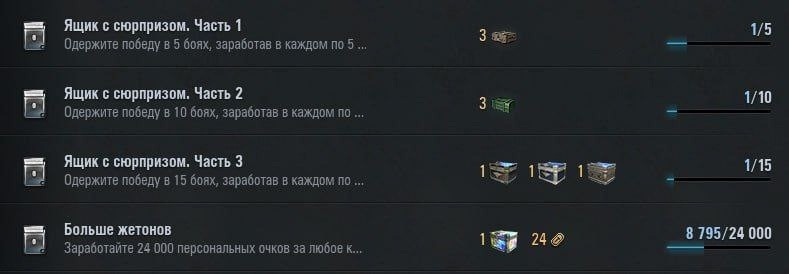 ВАЖНО: эти задачи выполняются не последовательно, т.е. вам не нужно играть 5 + 10 + 15 боёв, а только 15 боев при условии победы в каждой битве.
