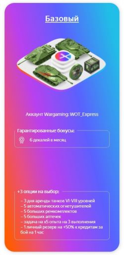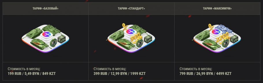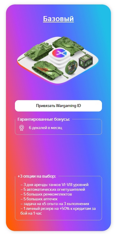 С декабря 2021 г. Wargaming (WOT) и Яндекс представили трёхуровневую подписку по которой можно получить некоторые плюшки в нашей любимой игре. Контракт рассчитан минимум на полгода и 1 числа каждого месяца ассортимент обновляется.