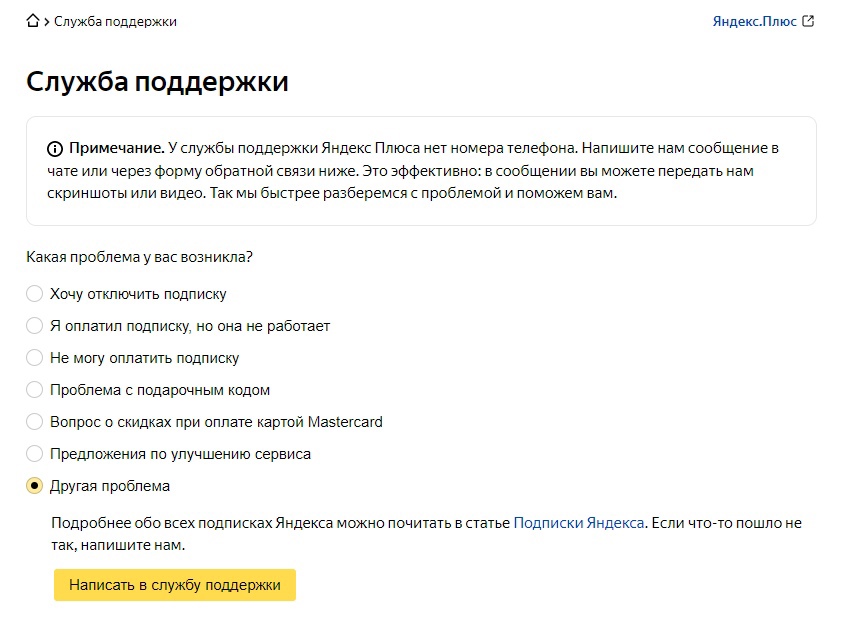 4. Далее переходим по прямой ссылке на сайт поддержки Яндекс Плюса: https://yandex.ru/support/plus-ru/troubleshooting.html#troubleshooting выбираем последний раздел «Другая проблема» и жмём жёлтую кнопку «Написать в службу поддержки».