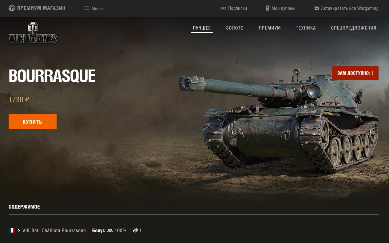 Bat.-Châtillon Bourrasque: (без %), есть возможность выкупа за 1738 ₽ только в премиум магазине на сайте.