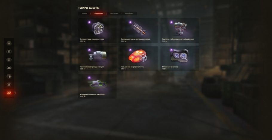 В разделы «Обслуживание» и «Товары за боны» добавлено оборудование «Повышенная снарядостойкость».