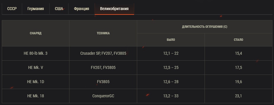 Длительность оглушения и сила воздействия оглушения на экипаж теперь являются фиксированными величинами и больше не зависят от величины нанесённого урона. Однако по-прежнему могут меняться в зависимости от оборудования, которое было установлено на машину-цель.