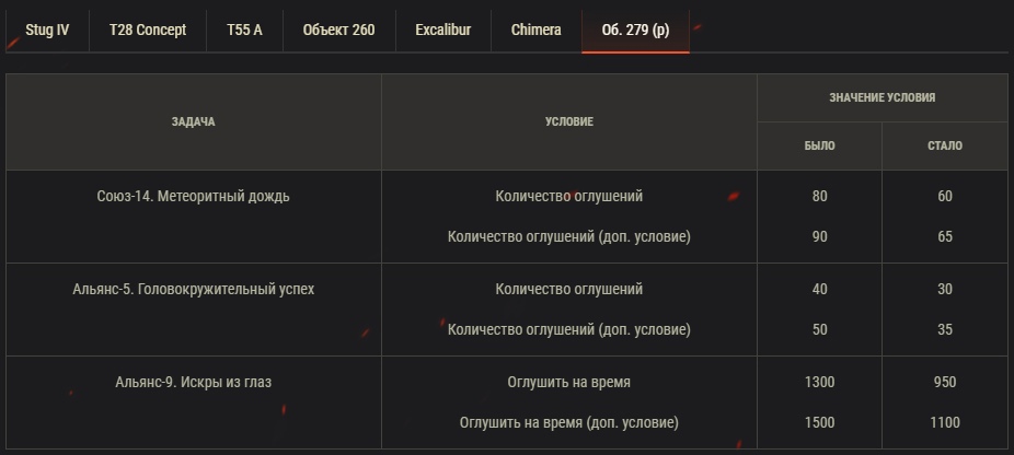 Упрощены условия задач, связанные с общим временем оглушения (оно уменьшено на ~20%)и количеством оглушений за бой, если требовалось оглушить 5 или более машин. Это связано с уменьшением потенциального времени оглушения у САУ, невозможностью наложить повторное оглушение, а также переработкой снаряжения для последующих обновлений.