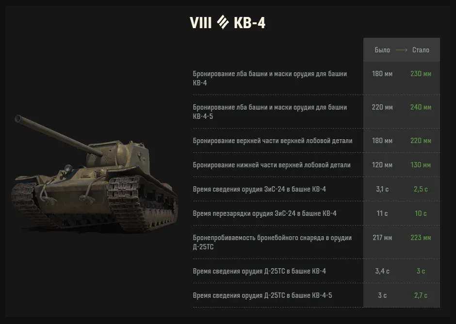 Из-за изменения диапазона боёв КВ-4 реже встречает удобные цели, поэтому танку апают живучесть за счёт усиления брони — это поможет увереннее держаться против одноклассников.