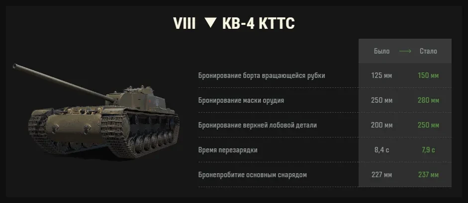 После изменения диапазона боёв КВ-4 КТТС реже реализует свою броню. Ап направлен на усиление роли: улучшили защиту, пробитие и скорострельность, чтобы танк увереннее держал позиции и играл как штурмовая машина.