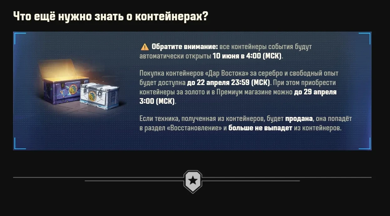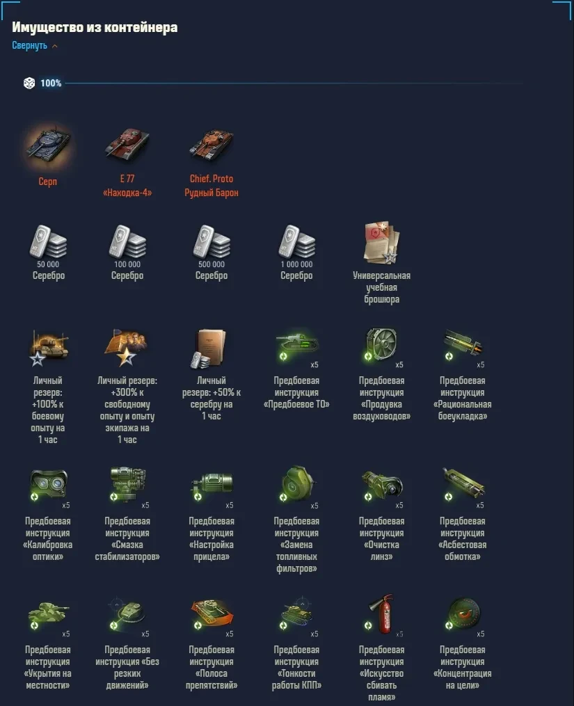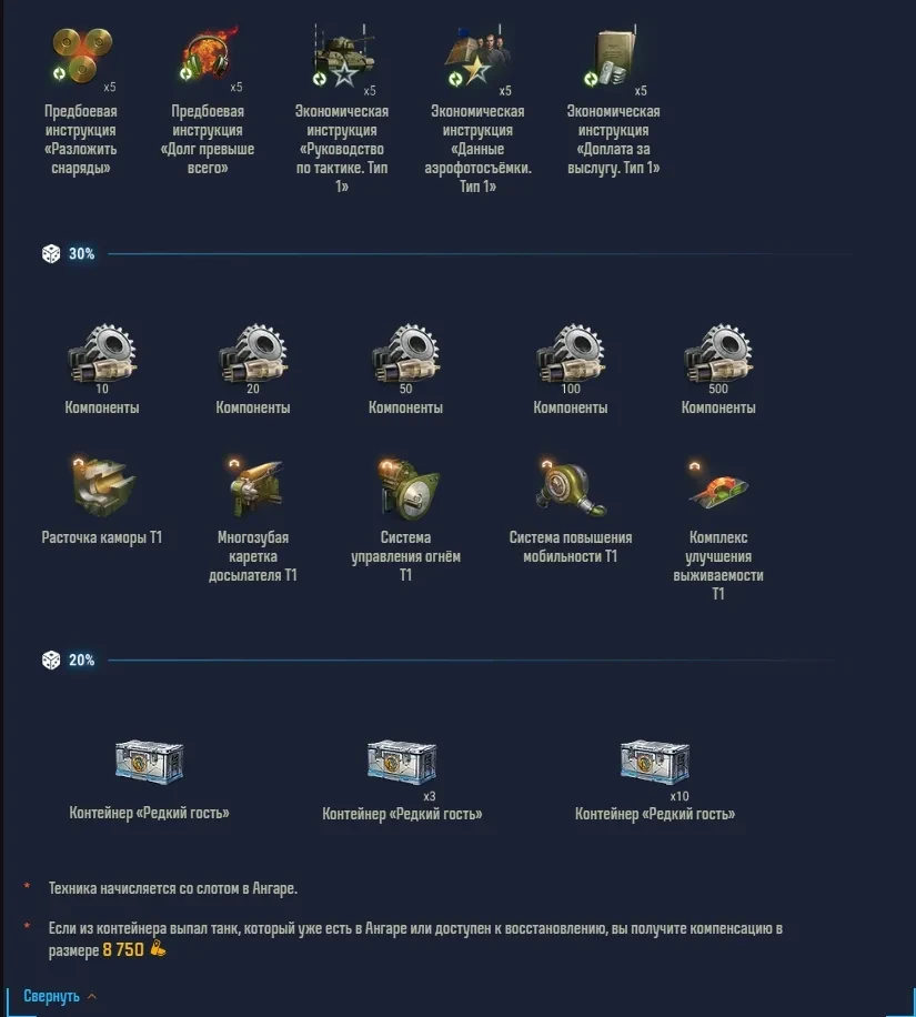** Если из контейнера выпал танк, который уже есть в Ангаре или доступен к восстановлению, вы получите компенсацию в размере 8 750 голды.