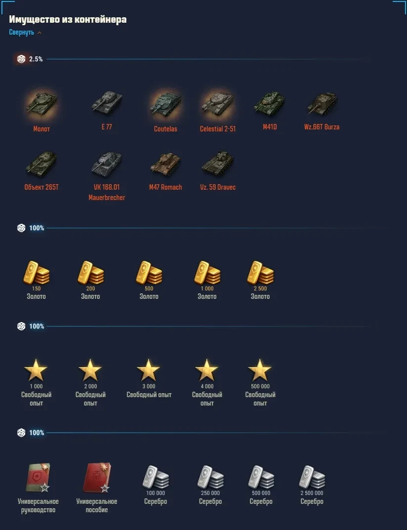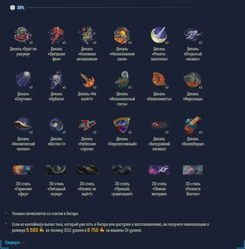* Если из контейнера выпал танк, который уже есть в ангаре или доступен к восстановлению, вы получите компенсацию: 5 500 золота за технику VIII уровня и 8 750 золота за машины IX уровня.