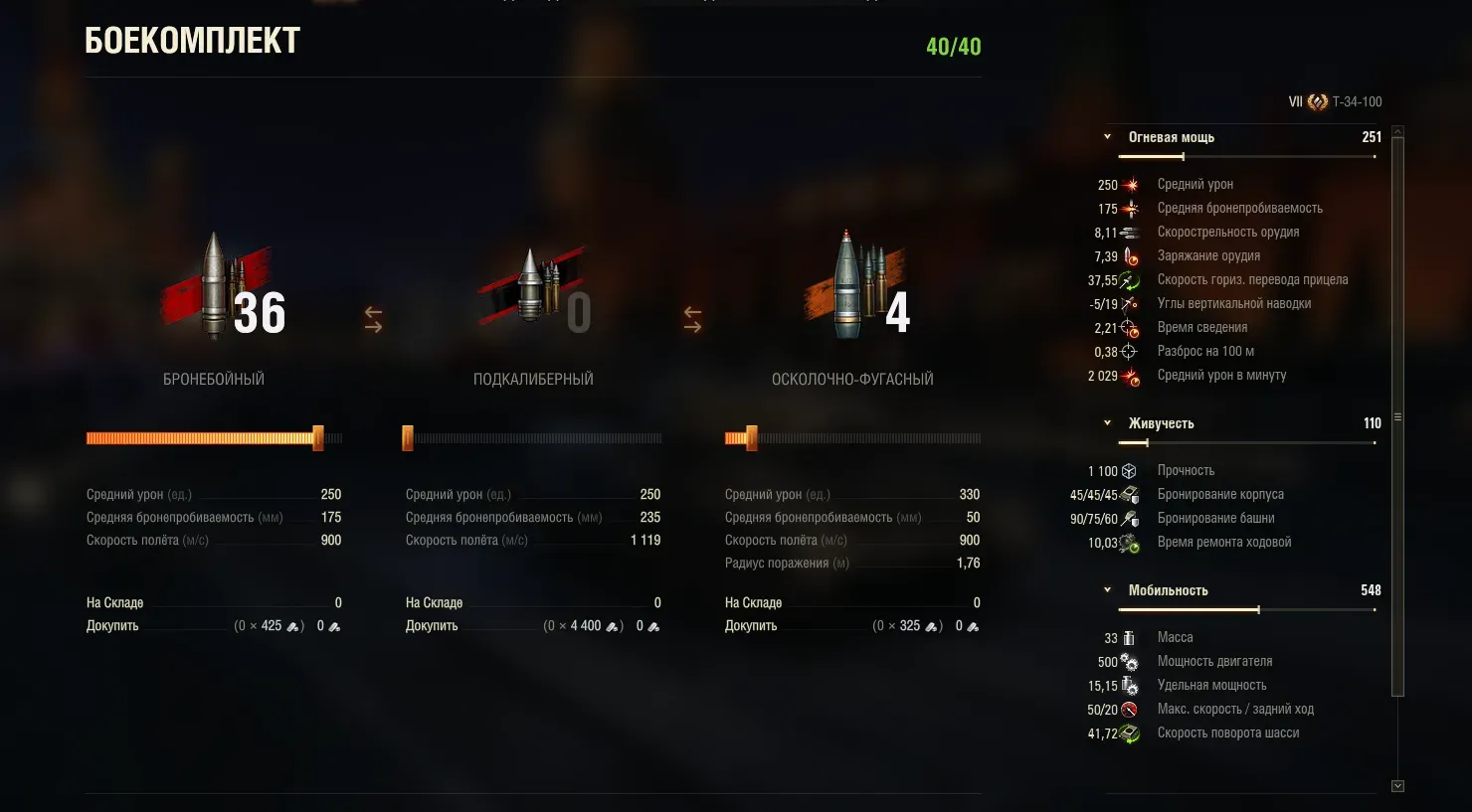 - Снаряды: бронебойный/подкалиберный/осколочно-фугасный