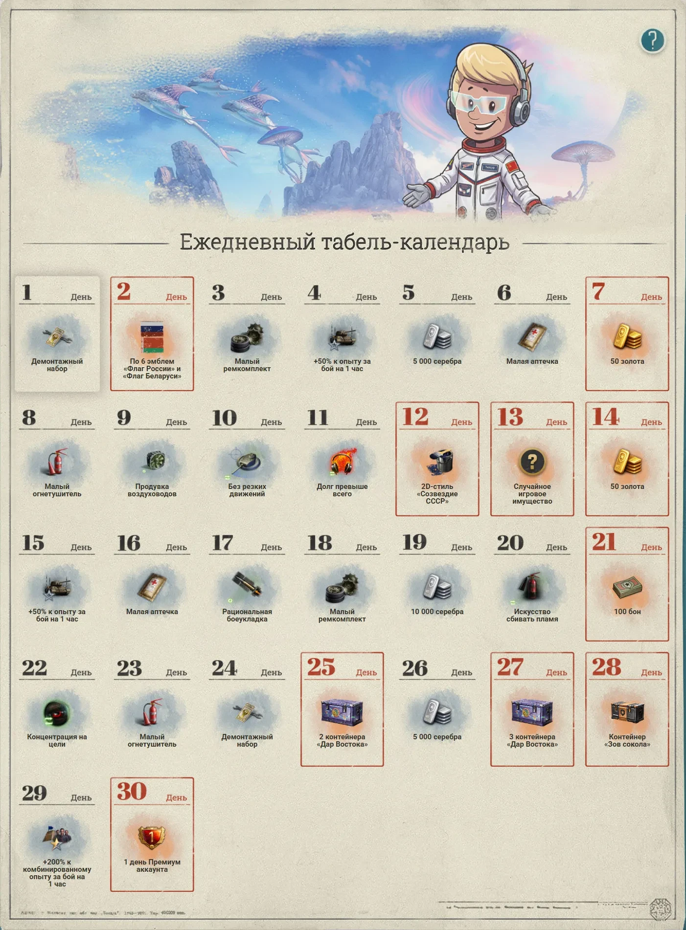 - Если вы забрали награду в календаре, но не зашли в игру до 3:00 (МСК) следующего дня, награда не будет доставлена. Пока вы её не заберёте, награда следующего дня не откроется.