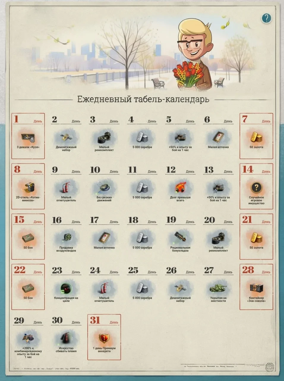 - Если вы забрали награду в календаре, но не зашли в игру до 3:00 (МСК) следующего дня, награда не будет доставлена. Пока вы её не заберёте, награда следующего дня не откроется.