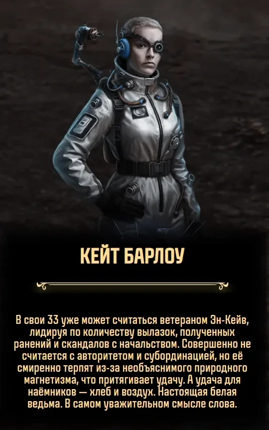 В свои 33 уже может считаться ветераном Эн-Кейв, лидируя по количеству вылазок, полученных ранений и скандалов с начальством. Совершенно не считается с авторитетом и субординацией, но её смиренно терпят из-за необъяснимого природного магнетизма, что притягивает удачу. А удача для наёмников — хлеб и воздух. Настоящая белая ведьма. В самом уважительном смысле слова.