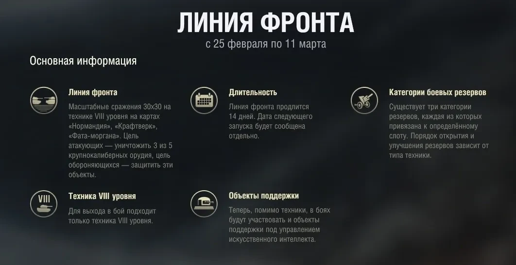 Подробнее о нововведениях можно почитать тут: https://wotexpress.info/news/mir-tankov/ekspeditsiya/liniya-fronta/obnovlyonnaya-liniya-fronta-25-fevralya-v-mire-tankov/