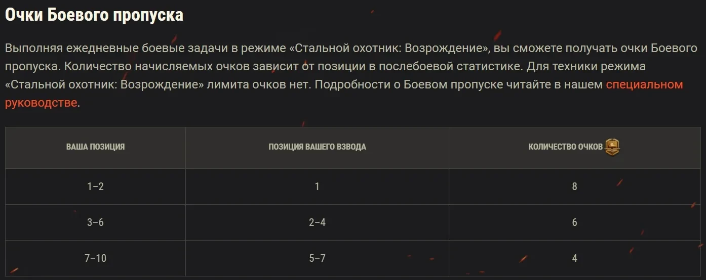 Выполняя ежедневные боевые задачи в режиме «Стальной охотник: Возрождение», вы сможете получать очки Боевого пропуска. Количество начисляемых очков зависит от позиции в послебоевой статистике. Для техники режима «Стальной охотник: Возрождение» лимита очков нет.