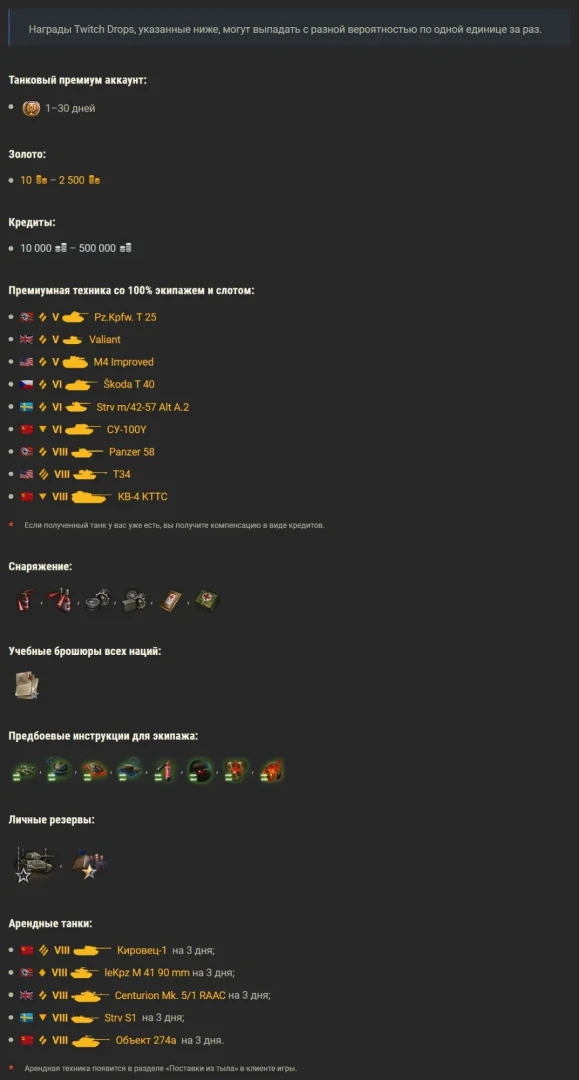 Выдаются за просмотр стримов в категории игры «Mir Tankov» на стримах с включенной функцией «Drops» (прямая сcылкa: https://www.twitch.tv/directory/category/mir-tankov?filter=drops). Список обещанных наград см. на 2 скрине.