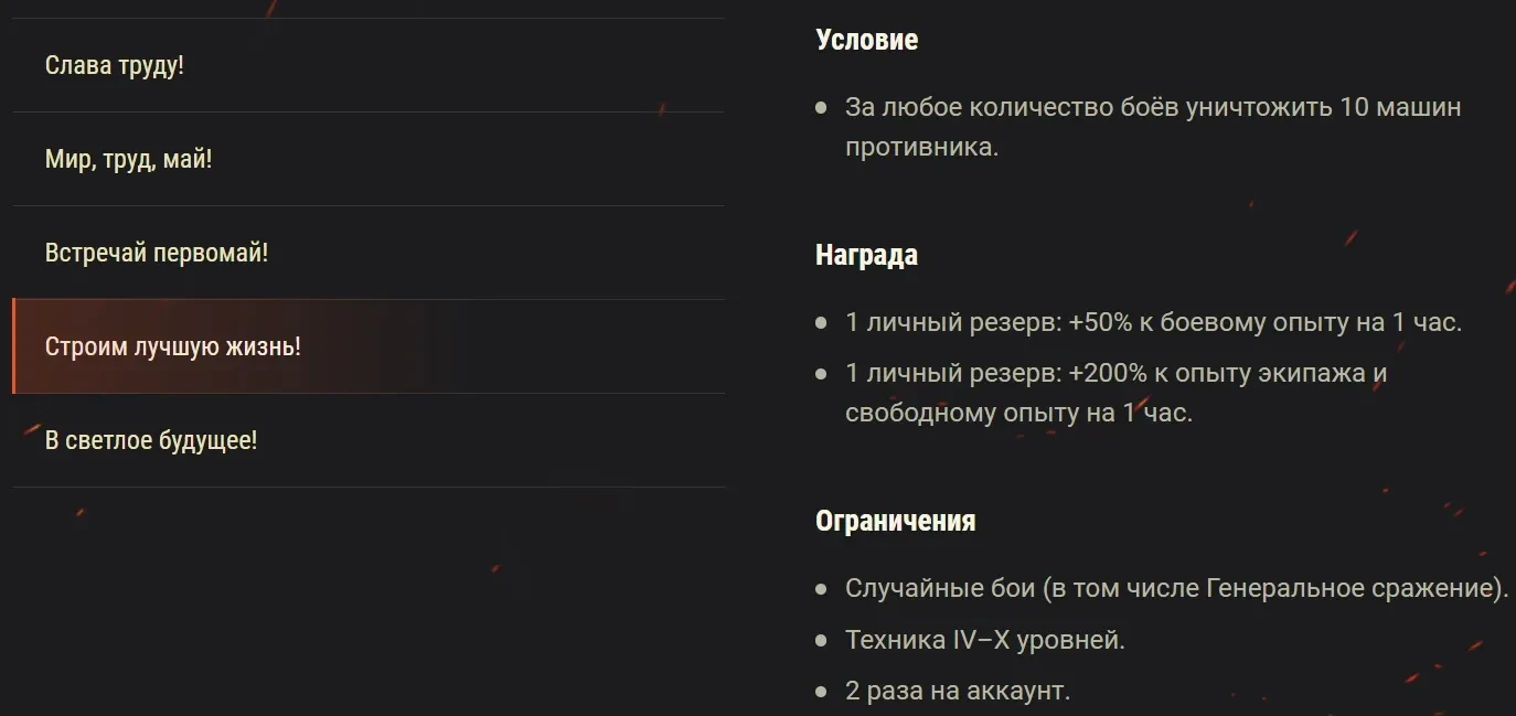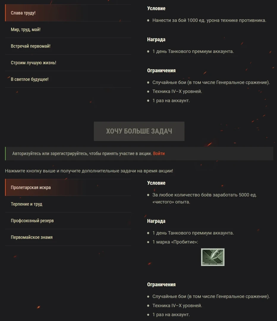 - Первомайские боевые задачи с НОВЫМ тематическим 2D-стилем «Ударник» (ссылка), премиум аккаунтом, личными резервами и множеством других наград.