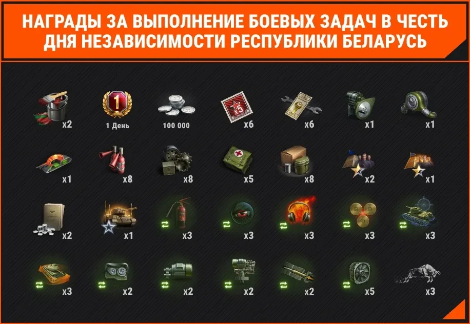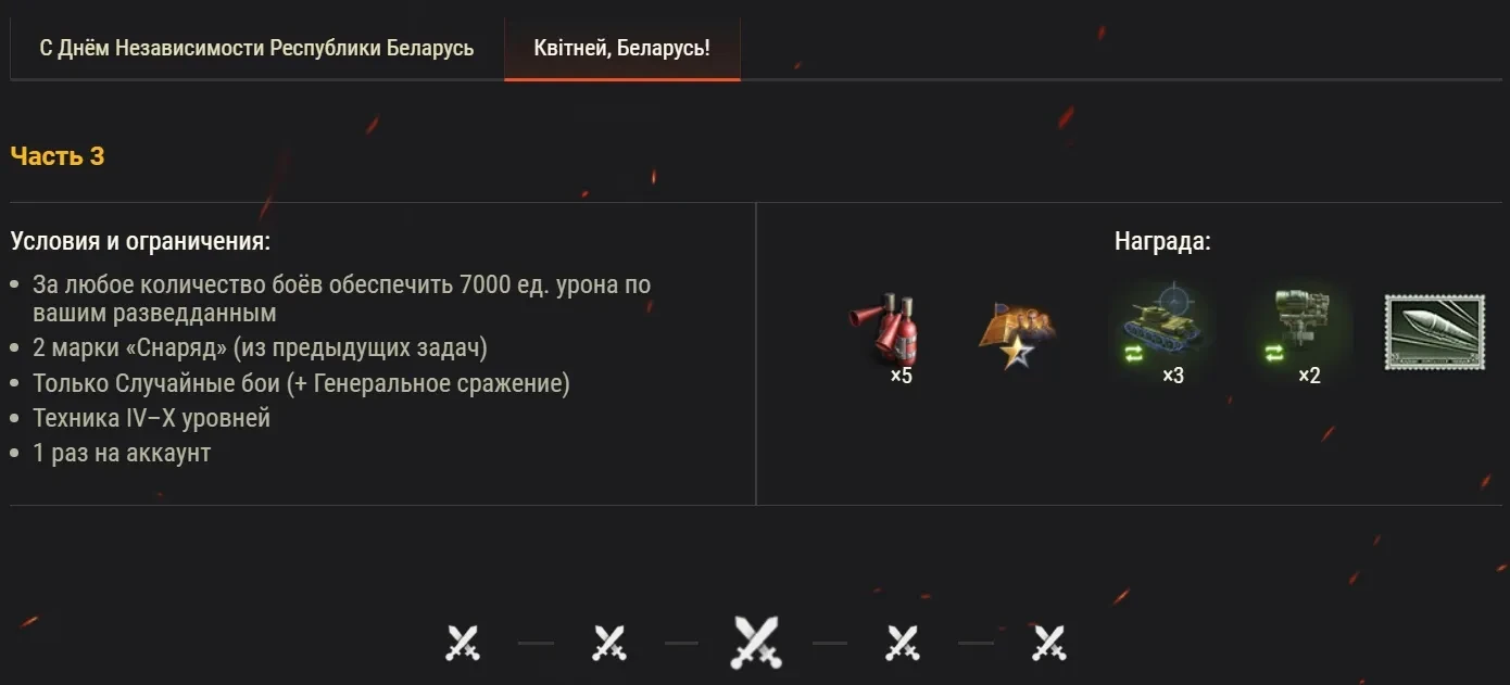 За обе цепочки задач вы можете получить 2 2D-стиля «Квiтней, Беларусь!», день премиум аккаунта, личные резервы, а также много других полезностей в «Танках».