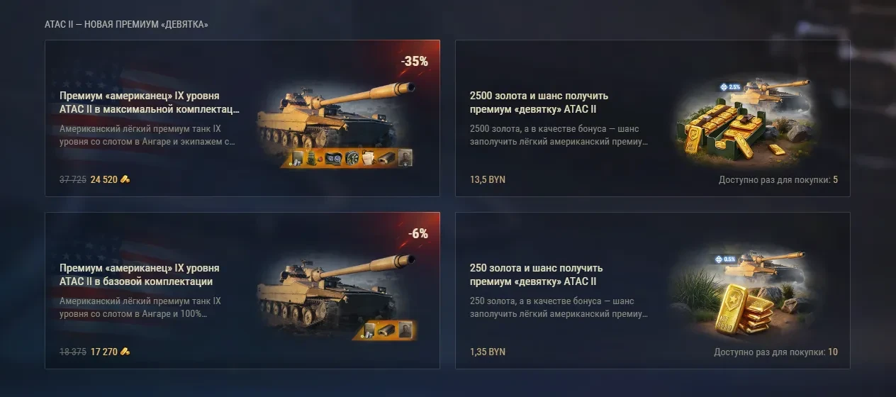 - Купить пакеты с 250 и/или 2500 золота и испытать удачу, так как бонусом также можно получить ATAC II. Вероятность 0.5% и 2.5% соответственно.