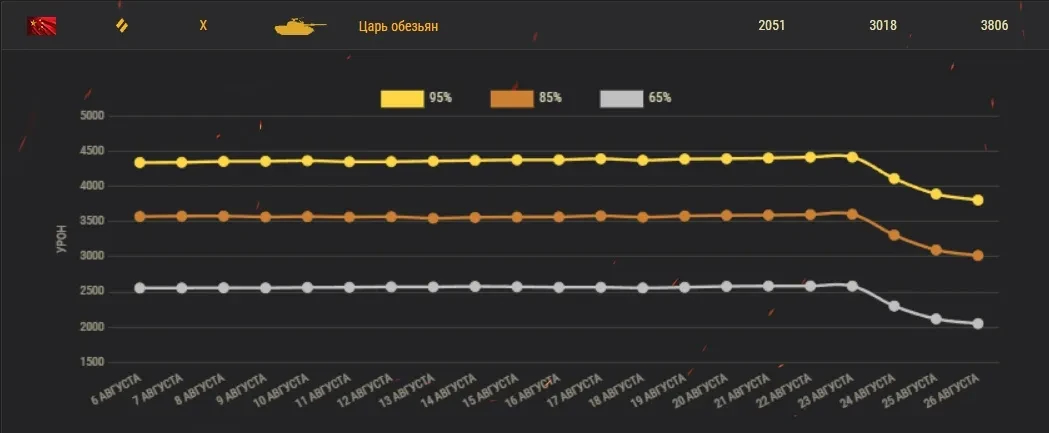22 августа в 15:50 (МСК) появилась возможность взять в аренду на 10 боев танк «Царь обезьян». Планка на 3-ю отметку опустилась с 4416 ед. до 3806 ед. за 3 дня.
