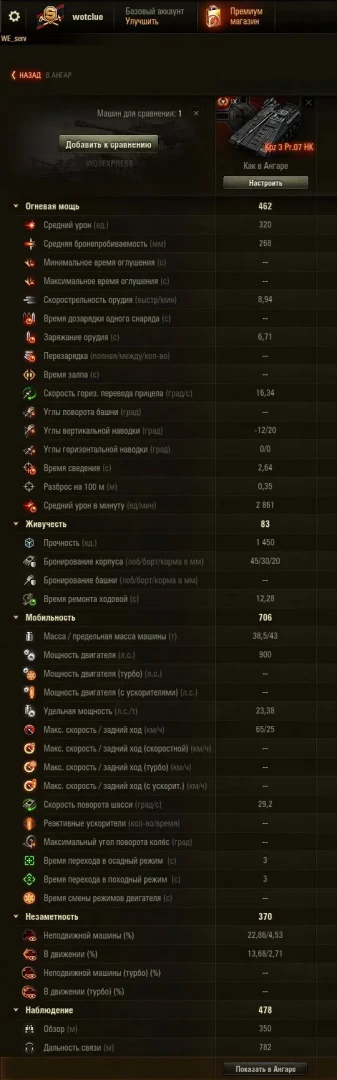 - Скорострельность орудия: 8,94 / 6,26 в режиме