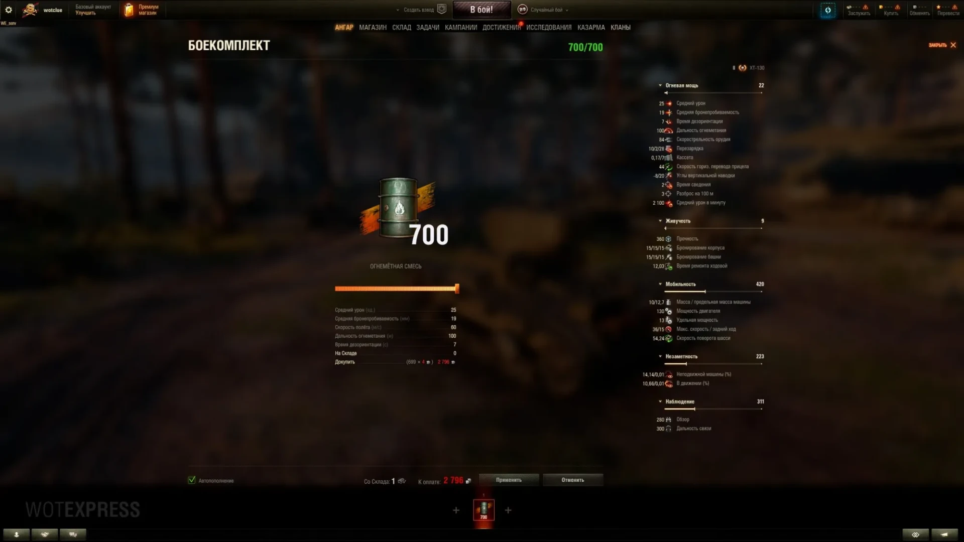 Некоторые параметры механики хоть и кажутся новыми, но по факту это изменённые старые, от фугасных снарядов. У танка присутствует полноценный артиллерийский прицел, который и показывает дальность полёта Огнемётной струи с навесом.