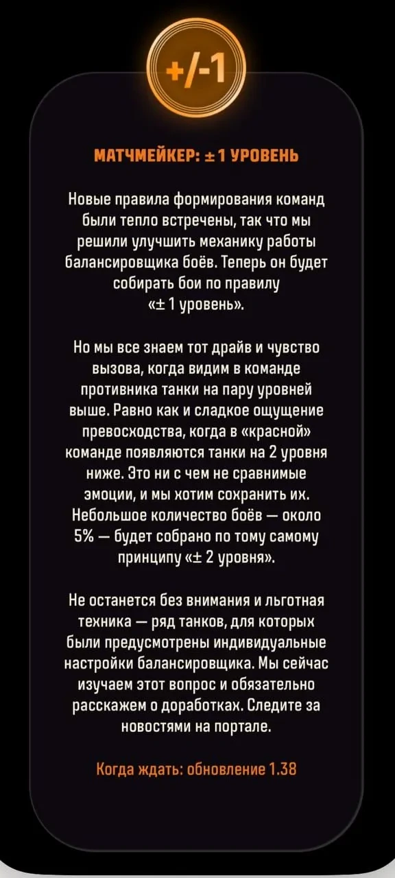 +/- 1 уровень: балансировщик будет собирать бои по правилу «±1 уровень» и лишь около 5% будут созданы по принципу «±2 уровня», для сохранения чувства вызова или ощущения превосходства в обновлении 1.38;