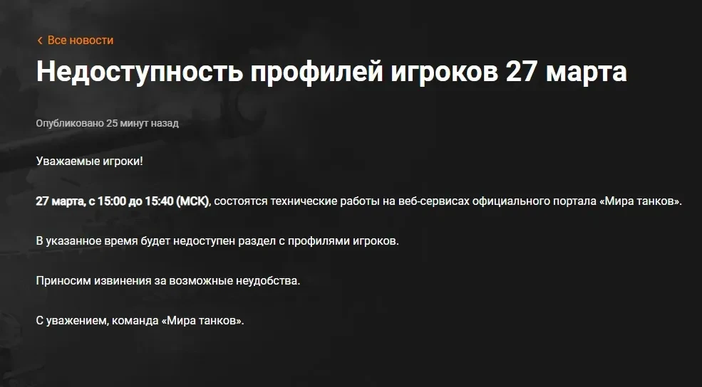 Сегодня с 15:00 до 15:40 мск будут техработы на портале танков. Будет недоступен раздел с профилями игроков.