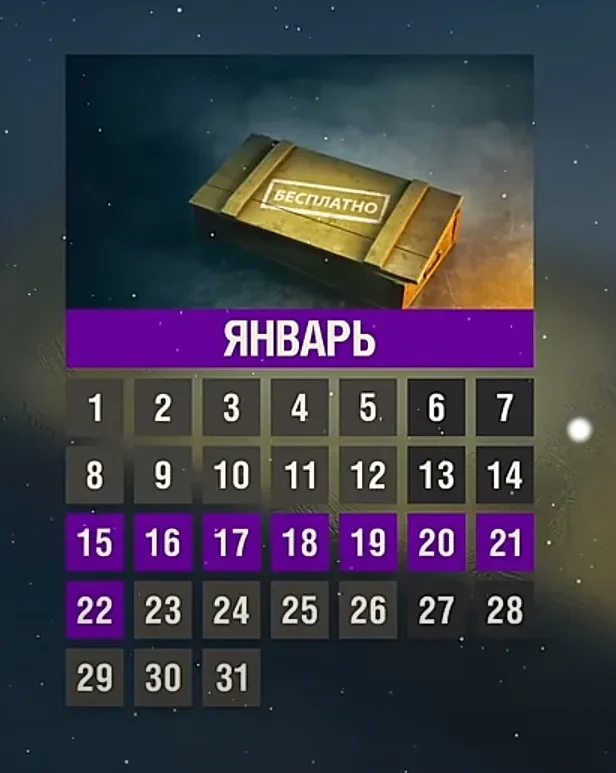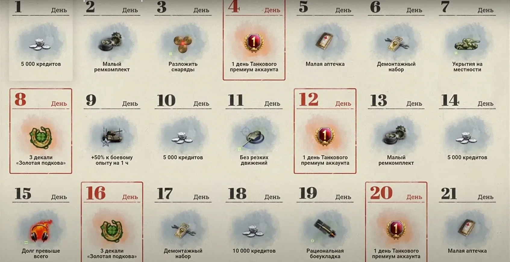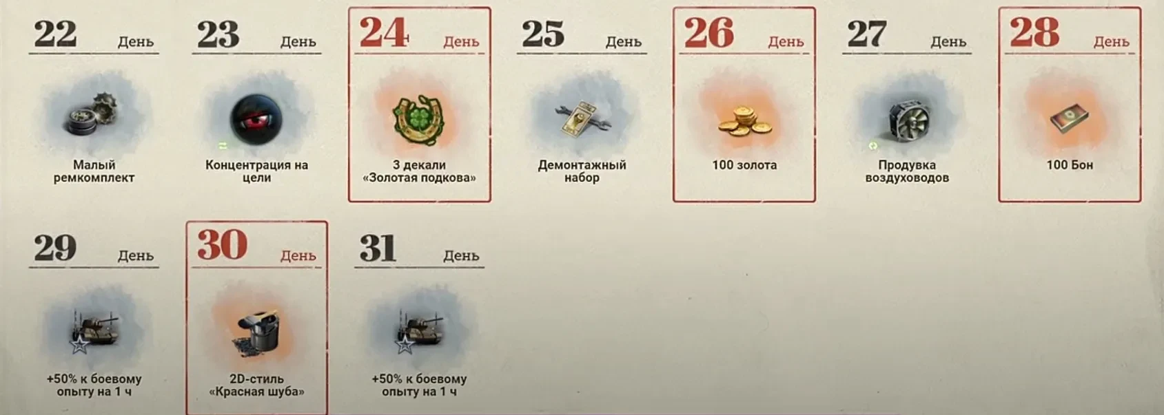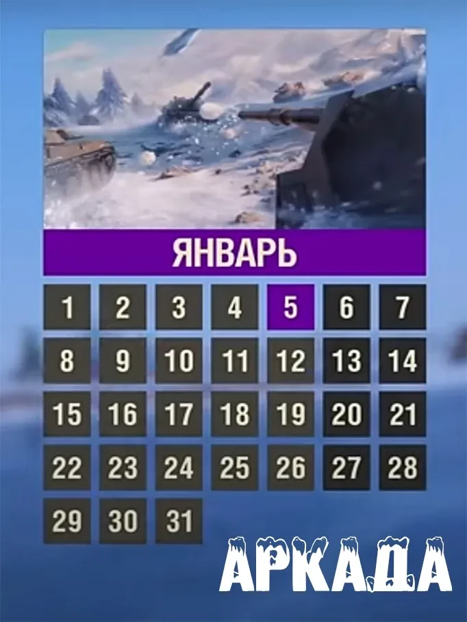 - 1 января на портале обновился табель-календарь. В наградах боны, золото, кредиты и дни ТПА. На 30-ый день можно забрать в календаре новый 2D стиль "Красная шуба".