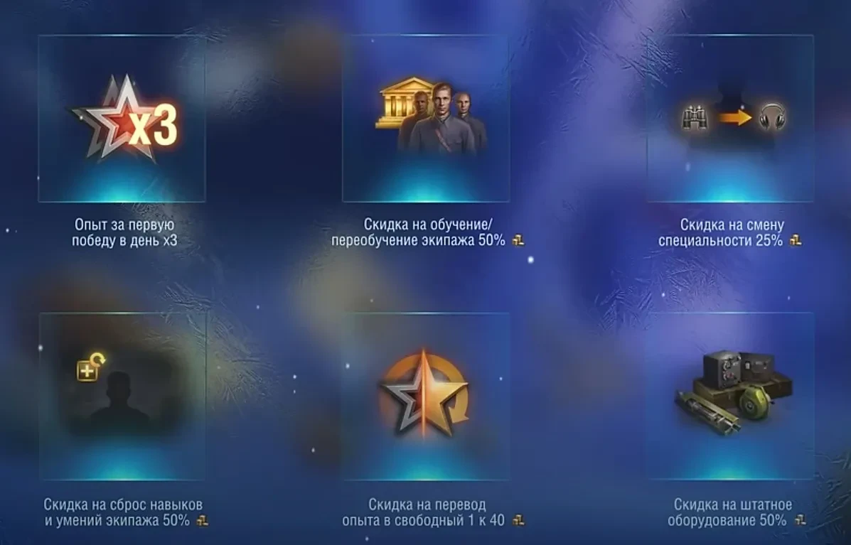 - До 9 января 3:00 (МСК) в игре проходит акция "С Новым годом!": х3 опыта за первую победу в день, перевод опыта с свободный 1:40, скидка 50% на штатное оборудование и на обучение/переобучение экипажа и сброс навыков и умений, скидка 25% на смену специальности.
