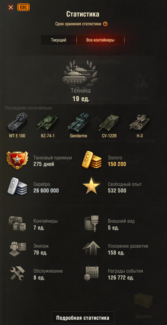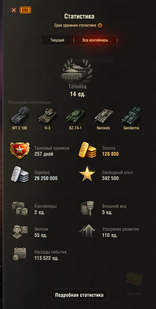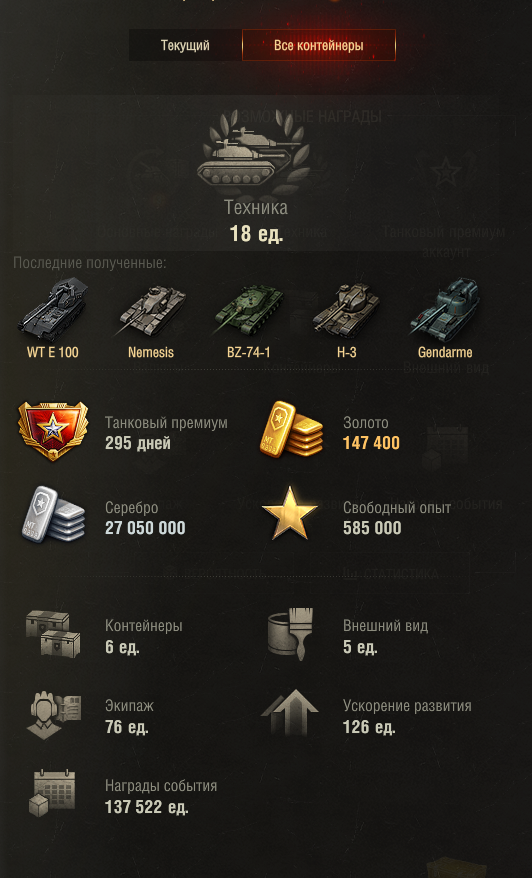 В среднем чтобы выбить все 12 танков из 3 этапов надо около 330-360 коробок. Максимально из 100к голды я получил 19 танков на акке, на 2 акках по 18 танков, на 4 акке 17, и на 5 акке всего 14 штук, потому что проепал и не купил набор коробок, а брал штучно.