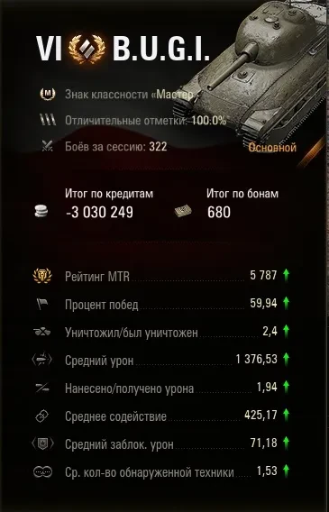 - 6 место. B.U.G.I — экипаж был 3 перка с помощью пособий докачал до 5. оборудование боново-трофейное + оптика + доппаек + инструкция, играл на голде, на топ пушке. В начале шел на 3 отметки, когда получил, позже дошел до 100% и больше не играл.