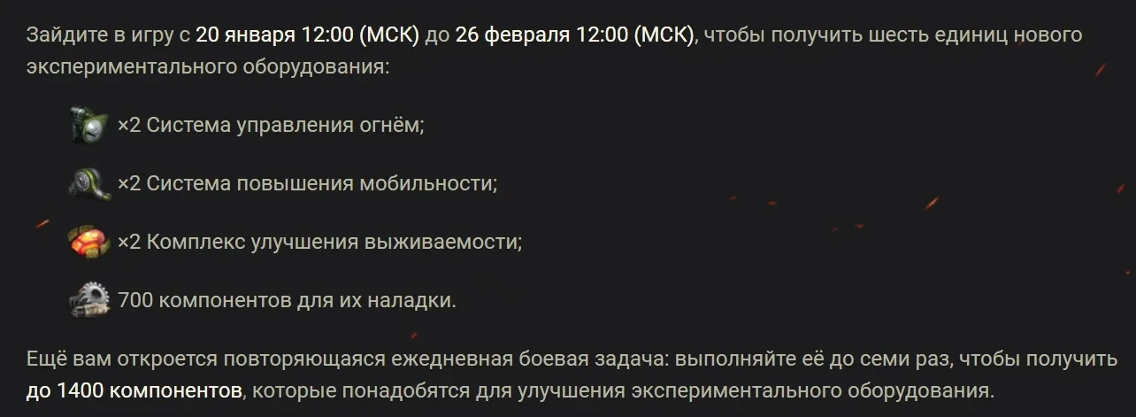 Зайдите в игру с 20 января 12:00 (МСК) до 26 февраля 12:00 (МСК), чтобы получить шесть единиц нового экспериментального оборудования: