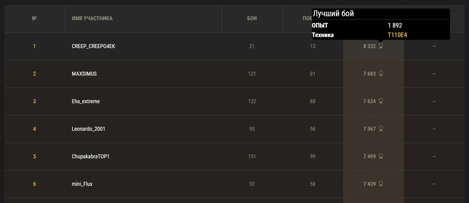Вчера на первые позиции вырвался уникум под ником CREEP_CREEPO4EK, который сделал космический суммарный опыт за небольшое кол-во боёв имея рыжую статистику и всего 1 ТОП в ангаре на котором он дал 14к.