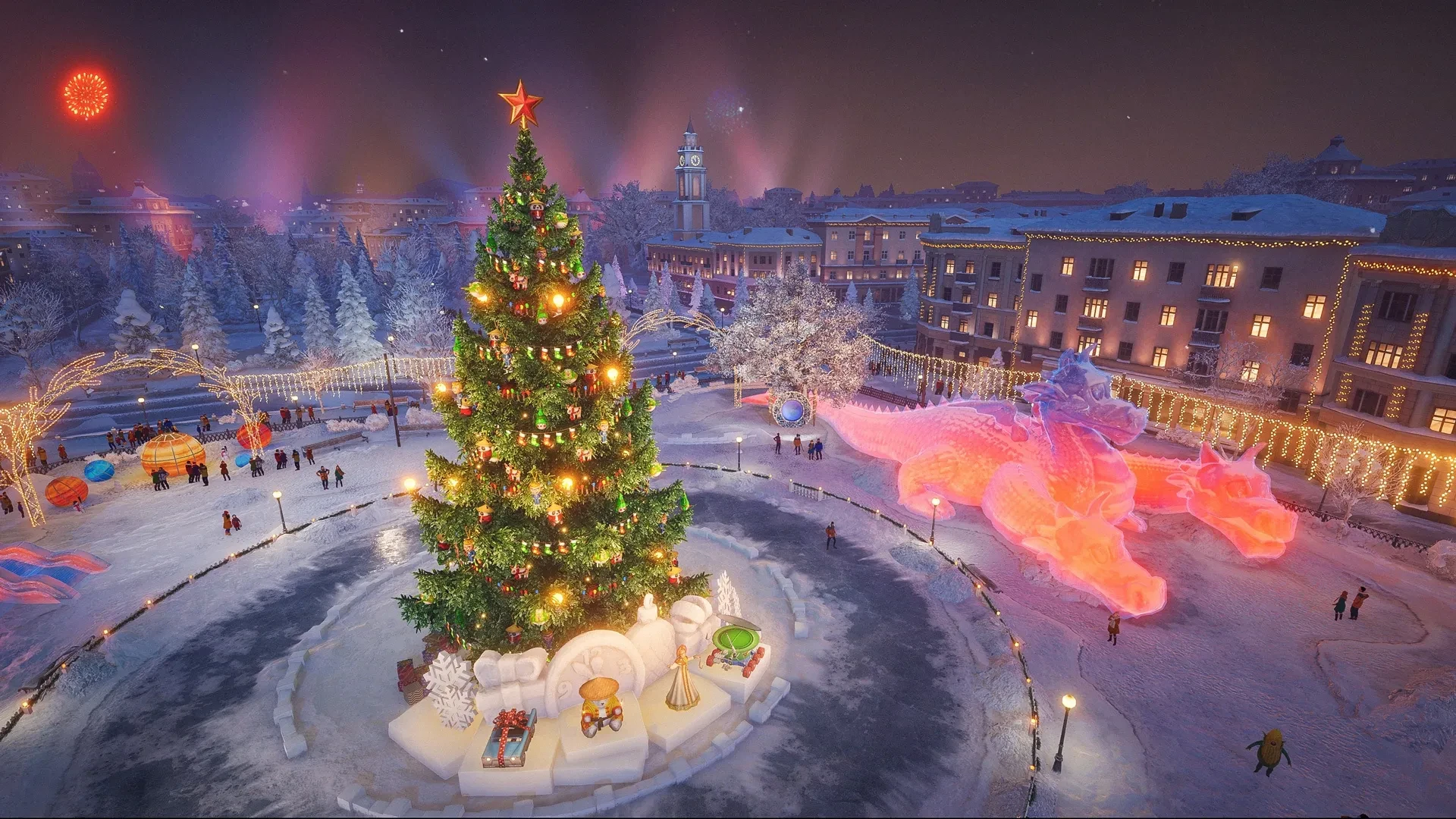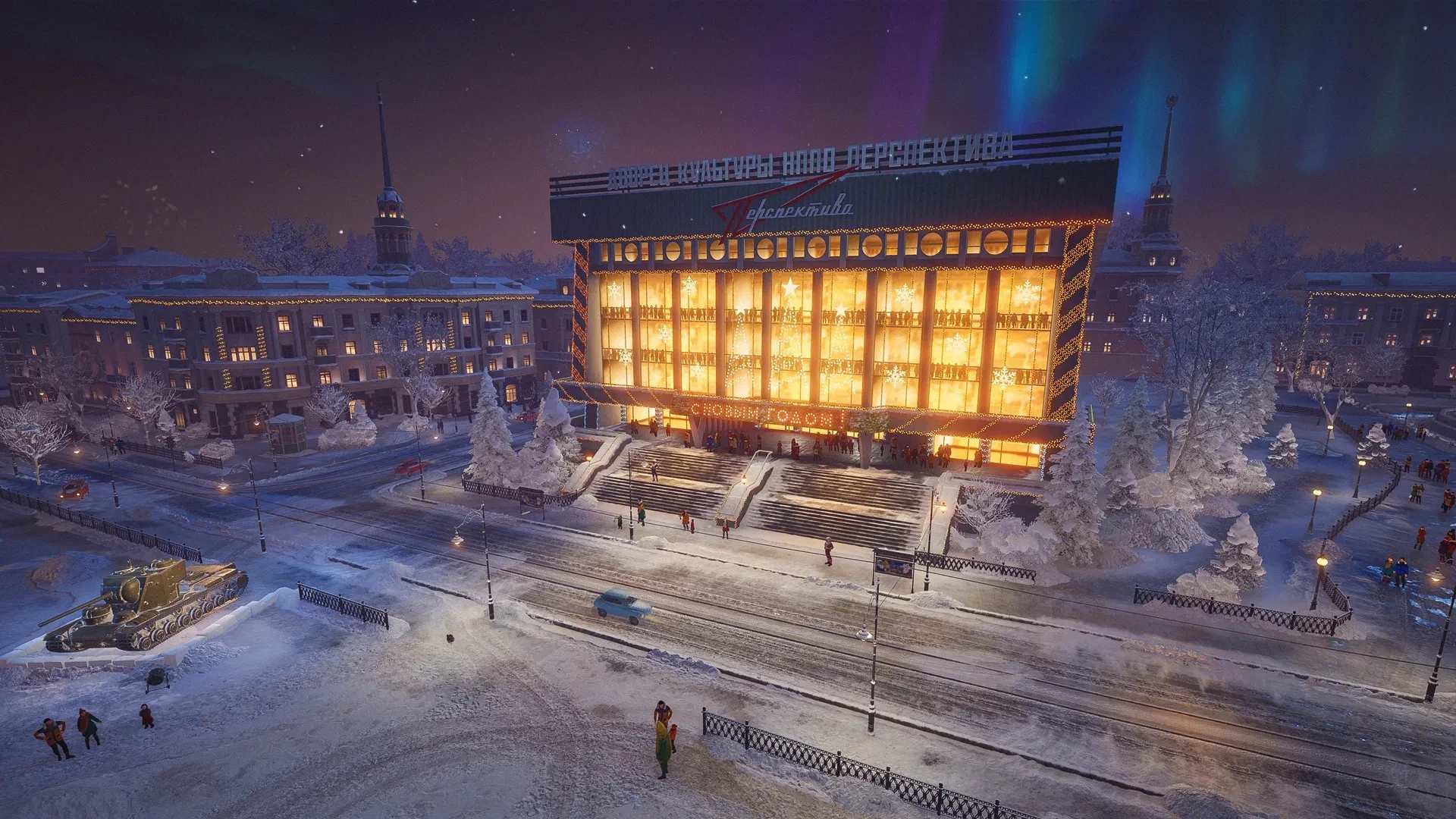 ИМХО, украшен ангар шикарно - красивая ёлка, снеговики, подарочные коробки, световые украшения, гигантские шары, огоньки на домах, гирлянды на площади, снег повсюду. На фоне видим прожекторы, которые подсвечивают праздничный салют и северное сияние на небе. Атмосферно, красиво и уютно.