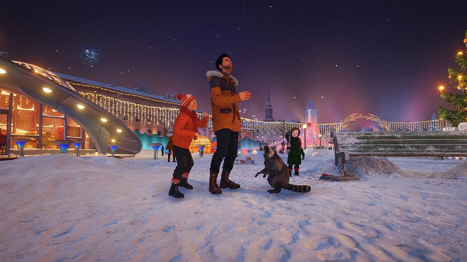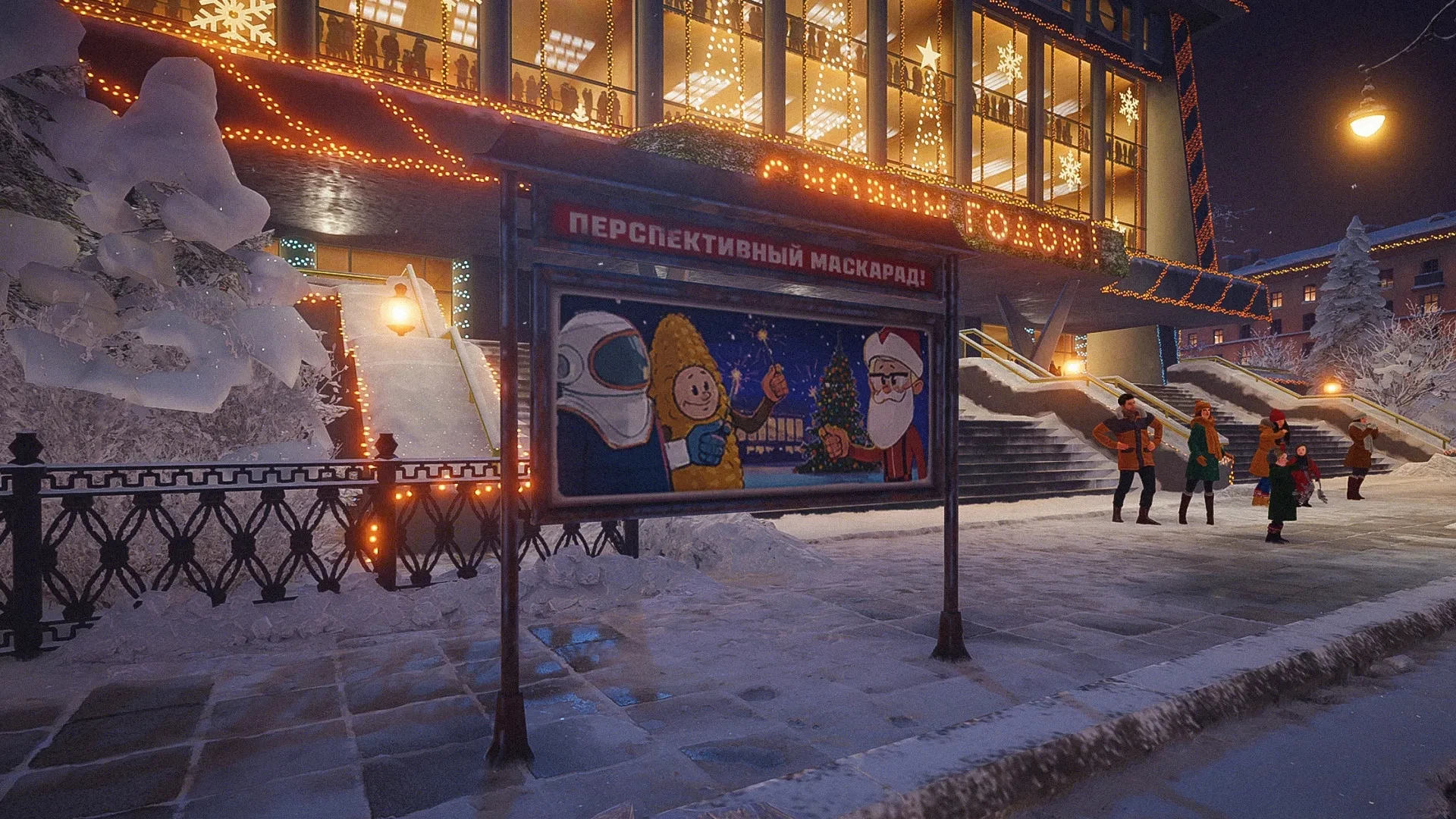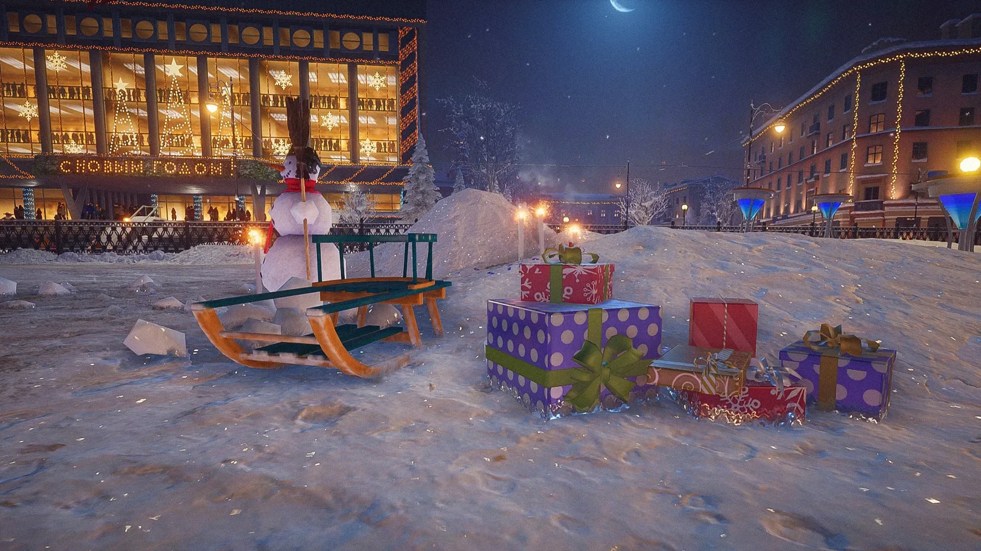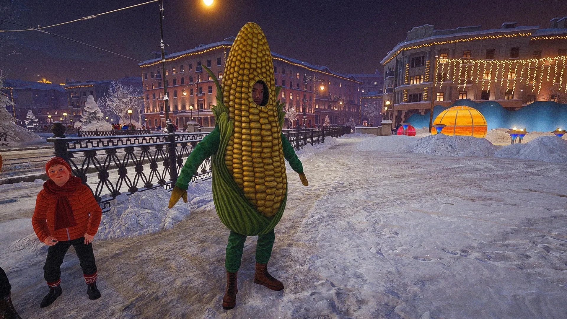 Обязательные атрибуты Нового года - Снеговик и... человек-кукуруза также присутствуют.