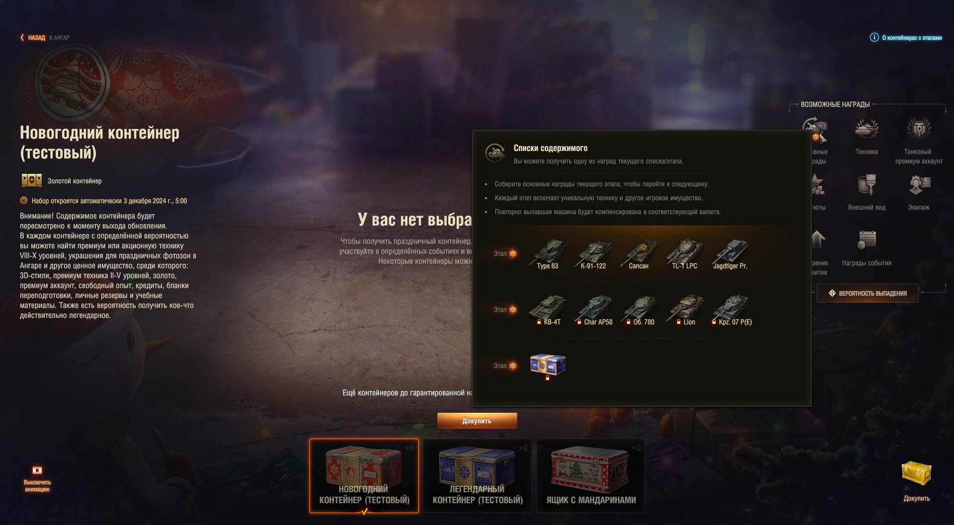 На тесте вот такой список техники в коробках. Выглядит вроде довольно реалистично, так как новые тачки из этого списка уже встречались в боях.