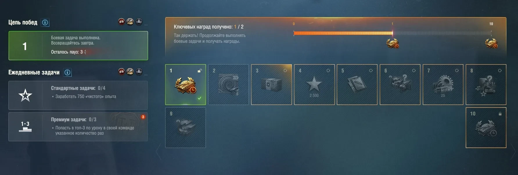 Выполнение ежедневных и еженедельных задач принесёт вам боны, кредиты, свободный опыт, случайные фрагменты чертежей, личные резервы и не только. Во время проведения Боевого пропуска вы сможете заработать очки пропуска, а с активным Премиум аккаунтом — ещё и бонусные награды.