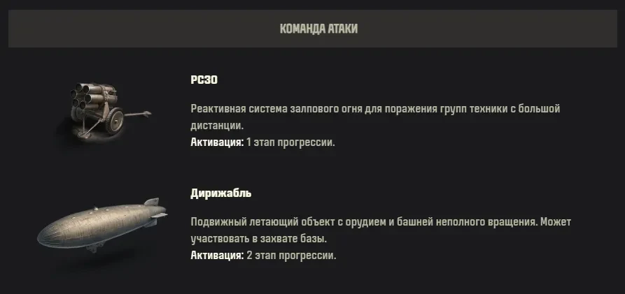 - РСЗО (атака, 1 этап) — реактивная система залпового огня для ударов по скоплениям техники с большой дистанции.